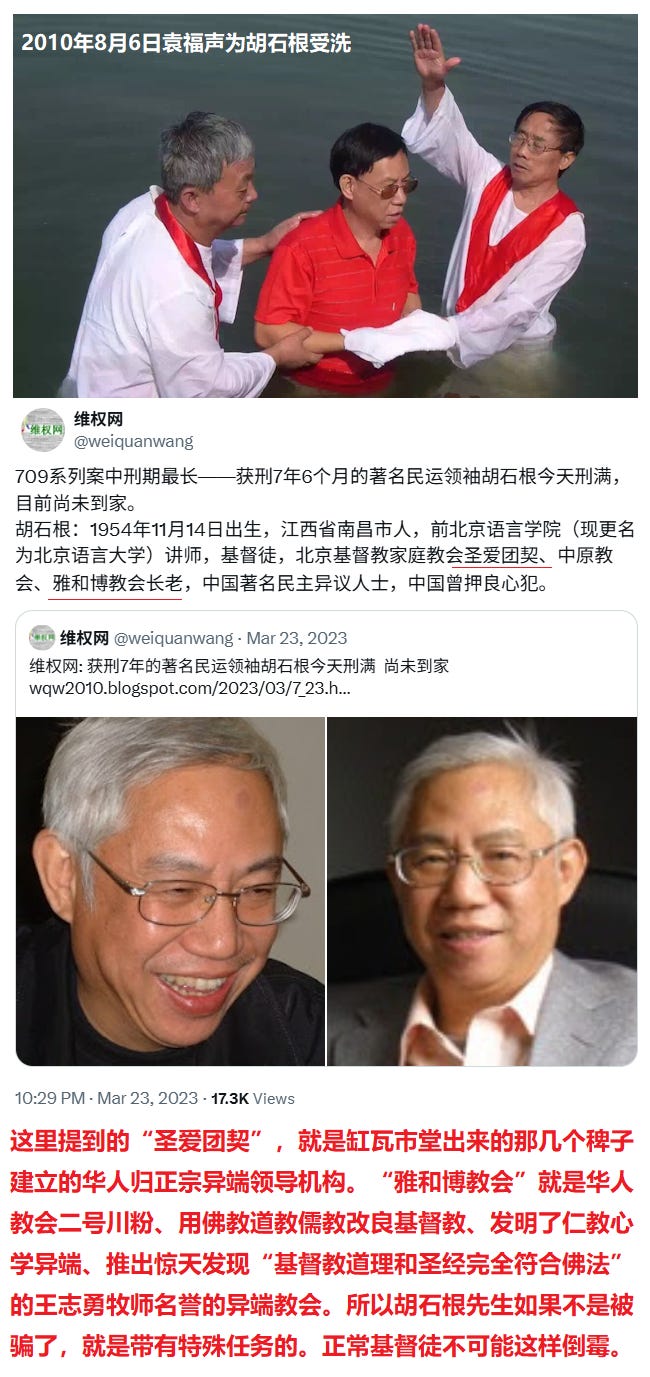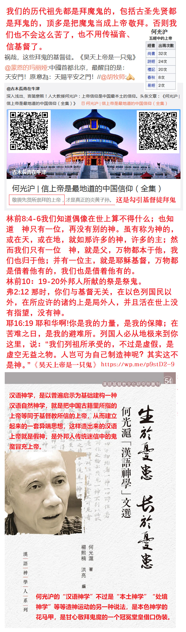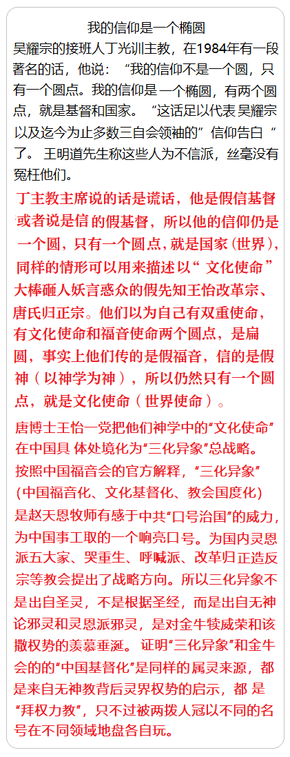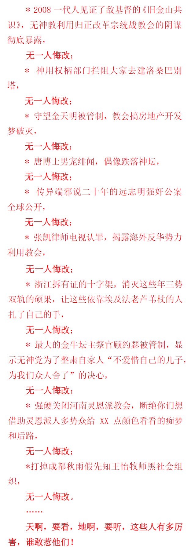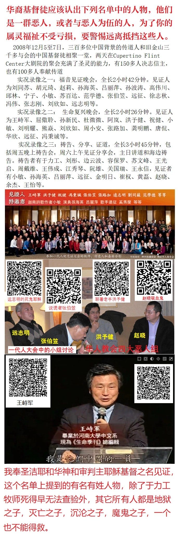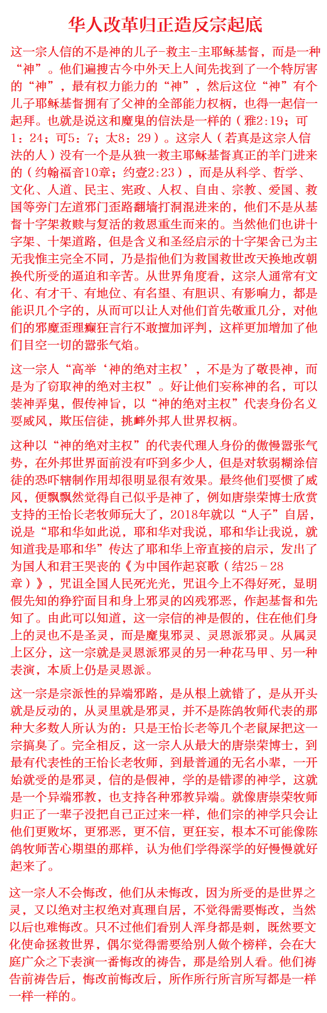 我们参考网名“我爱阿朱阿紫”弟兄三十年记录研究总结的宝贵成果,对后六四时代华人的震耳发聩良言:抛弃虚假的盼望——三十年来我党利用民运遗产大肆虚假歪曲宣传,取得的最大战果就是塑造了一种虚假的盼望,让我国识字的不识字的人以为只要换掉某个人,或把我国变成美国那样,中国人就有出路了,就在地如天了,实现天国了。这是在耶稣基督十架救恩之外另立天梯,是虚假的盼望,无效的拯救。——无论是北京守望、锡安教会还是成都秋雨,三十年来所有打着归正宗改革宗长老宗招牌新涌现出来的教会(也不局限于这类教会),都在为这个统战战略服务,为阴间开了又广又大的门,掳掠真真假假的信徒坠落阴间火湖。