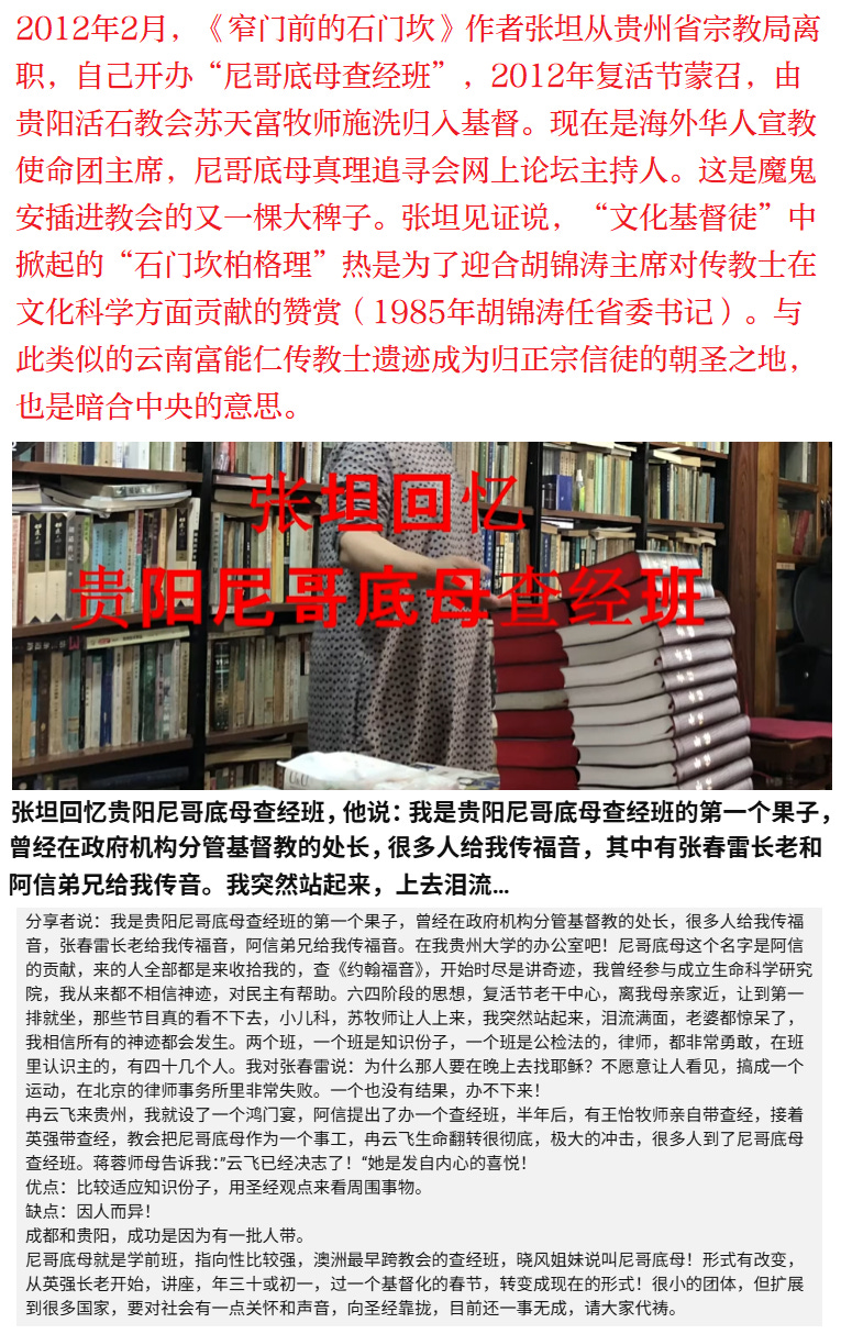 2012年2月,《窄门前的石门坎》作者张坦从贵州省宗教局离职,自己开办“尼哥底母查经班”,2012年复活节蒙召,由贵阳活石教会苏天富牧师施洗;现在是海外华人宣教使命团主席,尼哥底母真理追寻会网上论坛主持人。这是魔鬼安插进教会的又一棵大稗子。张坦见证说,“文化基督徒”中掀起的“石门坎柏格理”热是为了迎合胡锦涛主席对传教士在文化科学方面贡献的赞赏(时1985年胡锦涛任省委书记);张坦自己就是受此感召写了《石门坎》。与此类似的云南富能仁传教士遗迹成为归正宗信徒的朝圣之地,也是暗合中央的意思。