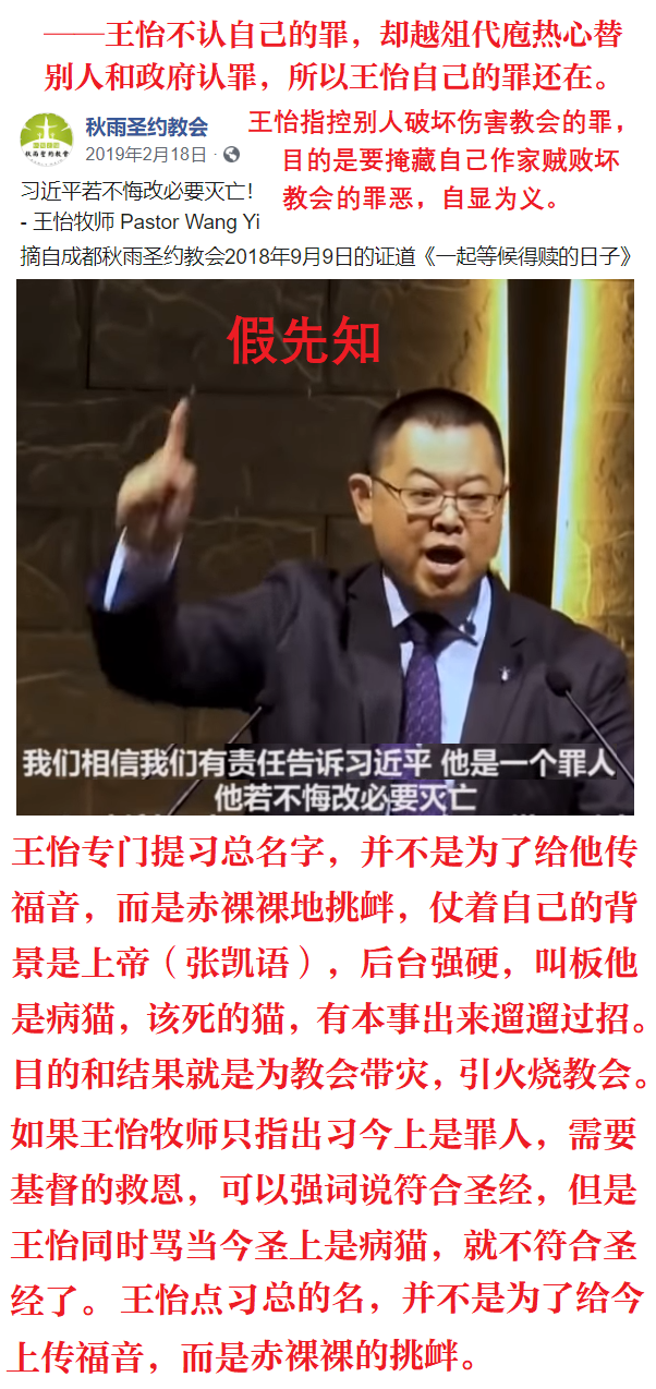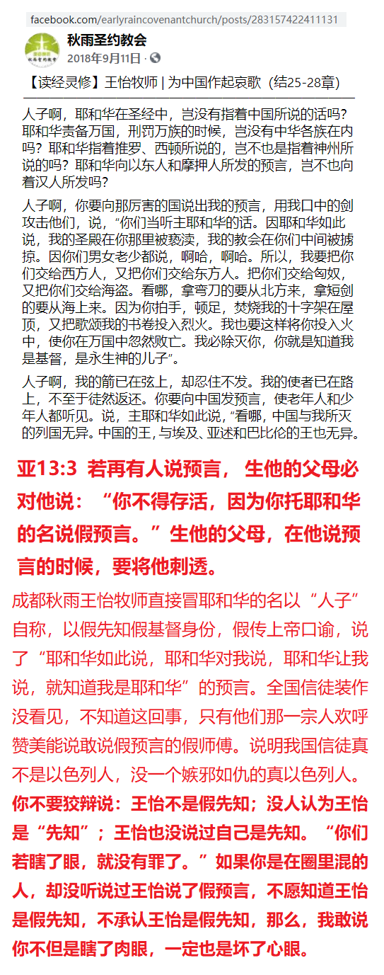 2018年9月,王怡用“人子”自称,假冒基督和先知,妄称妄传“耶和华如是说,耶和华对我说,耶和华让我说,就知道我是耶和华……”发出假预言,恶毒咒诅我国人民和君王,以假先知假基督身份为自己定了案。