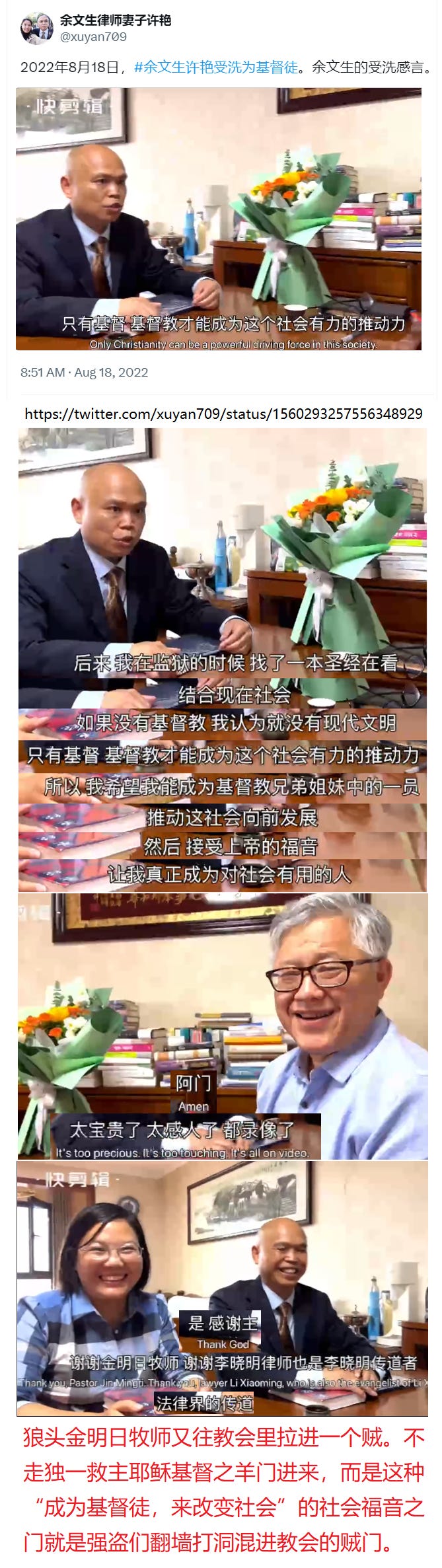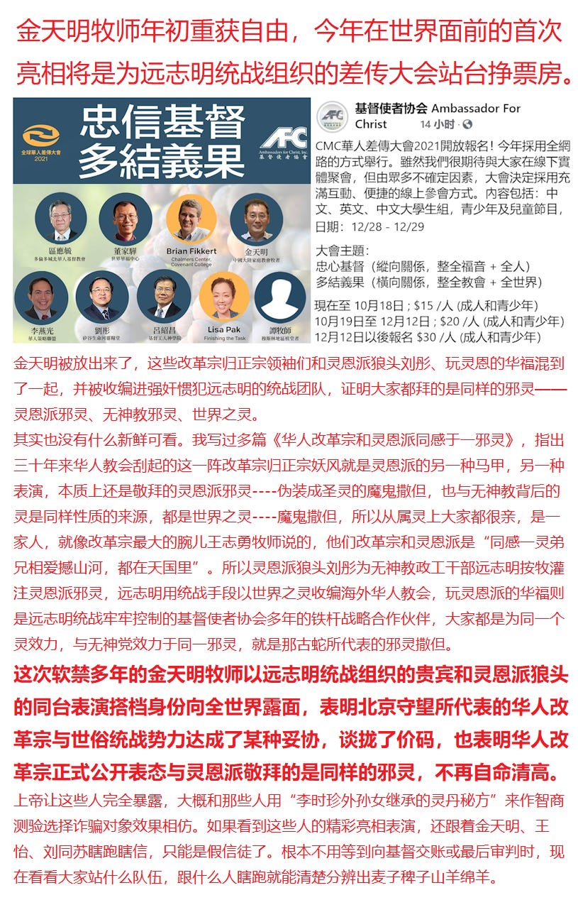 2021年,被软禁多年的北京守望金天明牧师被放出来,在世界世人面前的首次亮相是为远志明统战组织的“基督使者协会”“全球华人差传大会”站台助阵。